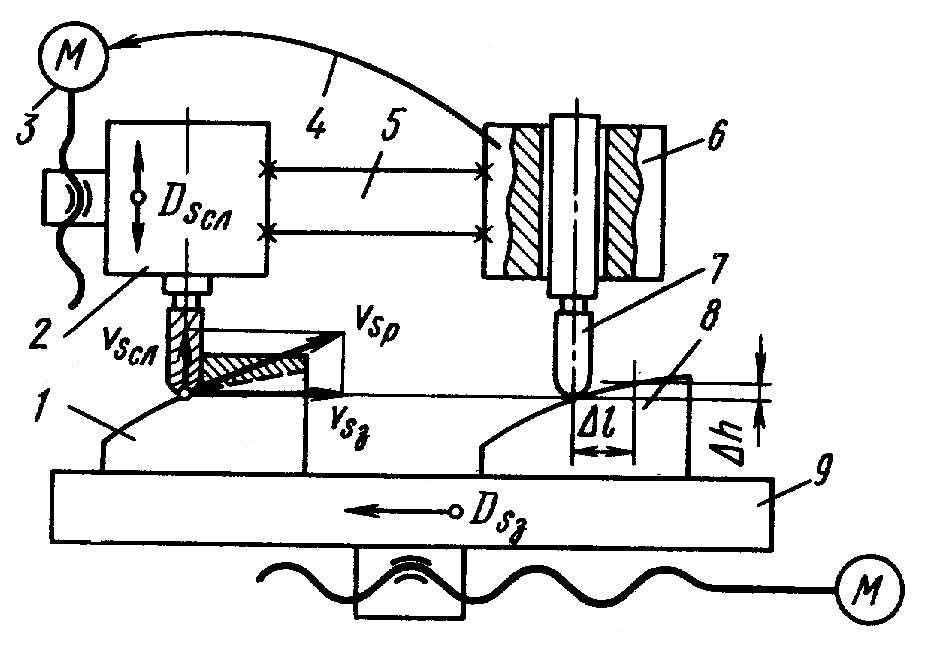 В механических копировальных системах копир выполняет функции управления и подачи режущего инструмента, воспринимая силы резания, а в следящих копировальных системах он осуществляет только функцию управления (рис. 1.5). Функцию рабочей подачи выполняет силовой следящий привод 3, получающий сигналы управления 4 от копировальной головки 6 и обеспечивающий шпиндельной бабке 2 следящее движение подачи DSсл. Это происходит при задающем движении DSз стола 9 с копиром 8 на расстояние ∆ l и подъеме щупа 7 относительно копировальной головки 6 на величину ∆ l. В результате при обработке заготовки 1 режущий инструмент перемещается со скоростями подач VSсл и VSз с получением результирующей скорости подачи. Рассмотренный принцип работы следящих копировальных систем позволяет изготовлять копир из легкообрабатываемого материала, снижать его износ и тем самым повышать точность обработки. Резко сокращаются трудоемкость и стоимость изготовления копира. Следящие копировальные системы управления в основном на токарных и фрезерных станках. Копировальные системы управления, как и системы управления с распределительными валами, большей частью просты по конструкции, надежны в работе и имеют невысокую стоимость. Однако преобразование числовой информации чертежа изделия в аналоговый вид (кулачки, копиры) требует трудоемкого проектирования, изготовления физических аналогов и их последующей наладки на станке. Это приводит к низкой мобильности данных систем управления, а указанное преобразование числовой информации приводит к погрешностям передачи информации, возникающим при изготовлении кулачков и копиров и вследствие их изнашивания в процессе эксплуатации.