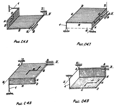 Тема: "Равновесие твердого тела, находящегося под действием произвольной пространственной системы сил" Две однородные прямоугольные тонкие плиты, сваренные под прямым углом друг к другу закреплены сферическим шарниром (или подпятником) в точке А, цилиндрическим шарниром (подшипником) в точке В и невесомым стержнем 1(рис. С40 - С4.7) или двумя подшипниками в точках А и В и двумя невесомыми стержнями 1 и 2 (рис. С4.8 - С4.9); все стержни прикреплены к плитам и к неподвижным опорам шарнирами. Размеры плит в направлениях, параллельных координатным осям X, Y, Z равны соответственно: - 2а, 3а и а (для рис. С4.0 - С4.4); - 2а, 3а и 4а (для рис. С4.5 - С4.9). При подсчетах принять а = 0,6 м. Вес большей плиты Р1 = 3 кН, вес меньшей плиты Р2 = 2 кН. Каждая из плит расположена параллельно одной из координатных плоскостей. На плиты действуют: - пара сил, с моментом М = 4 кН·м, лежащая в плоскости одной из плит; - две силы, величины которых, направления и точки приложения даны в таблице 4. Точки приложения сил находятся в углах или в серединах сторон плит. Определить реакции связей в точках А и В, а также: - реакцию стержня1 (для рис. С4.0 - С4.7) - или реакции стержней 1 и 2 (для рис. С4.8 - С4.9).