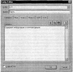 Рис. 10. Диалог Entity Editor Закладка Note 3 позволяет вводить примеры данных для сущности (в произвольной форме). В закладке Icon каждой сущности можно поставить в соответствие изображение, которое будет отображаться в режиме просмотра модели на уровне иконок (см. табл. 2). В этой закладке можно задать как большую иконку, которая будет отображаться на уровне Icon, так и малую иконку, которая будет отображаться на всех уровнях просмотра модели. Для связывания изображения с сущностью необходимо щелкнуть по кнопке , в появившемся диалоге ERwin Icon Editor щелкнуть по кнопке Import и выбрать соответствующий файл формата bmp. После выбора иконки она отображается в закладке Icon диалога Entity Editor (рис. 11).