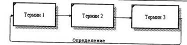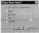 Рис. 18. Диалог Unique Name Option На практике такое переименование не всегда удобно, поэтому существует возможность отменить эту опцию. В диалоге Unique Name Option (меню Option/Unique Name) (рис. 18) можно задать следующие режимы именования атрибутов: Allow - позволить внесение одинаковых имен; Rename - переименовывать атрибуты (по умолчанию); Ask - запрашивать возможные действия каждый раз при внесении одноименных атрибутов. ERwin будет показывать на экране окно-диалог Edit Unique Name каждый раз, когда вводится неуникальное имя сущности или атрибута. В диалоге Edit Unique Name можно ввести другое имя или разрешить дублирование. При этом новое имя не проверяется на уникальность; Disallow - запретить внесение одинаковых имен. Если двойное имя обнаружено, то ERwin выдает на экран окно с сообщением, что ввод неуникальных имен запрещается. Каждый атрибут должен быть определен (закладка Definition), при этом следует избегать циклических определений, например когда термин 1 определяется через термин 2, термин 2 - через термин 3, а термин 3 в свою очередь - через термин 1 (рис.19).