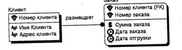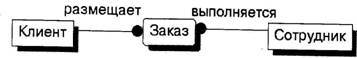 Рис. 20. Имя связи - Relationship Verb Phrases Связь показывает, какие именно заказы разместил клиент и какой именно сотрудник выполняет заказ. По умолчанию имя связи на диаграмме не показывается. Для отображения имени следует в контекстном меню, которое появляется, если щелкнуть левой кнопкой мыши по любому месту диаграммы, не занятому объектами модели, выбрать пункт Display Options/Relationship и затем включить опцию Verb Phrase. На логическом уровне можно установить идентифицирующую связь один-ко-многим, связь многие-ко-многим и неидентифицирующую связь один-ко-многим (соответственно это кнопки слева направо в палитре инструментов). В IDEF1X различают зависимые и независимые сущности. Тип сущности определяется ее связью с другими сущностями. Идентифицирующая связь устанавливается между независимой (родительский конец связи) и зависимой (дочерний конец связи) сущностями. Когда рисуется идентифицирующая связь, ERwin автоматически преобразует дочернюю сущность в зависимую. Зависимая сущность изображается прямоугольником со скругленными углами (сущность Заказ на рис. 21). Экземпляр зависимой сущности определяется только через отношение к родительской сущности, т. е. в структуре на рис. 21 информация о заказе не может быть внесена и не имеет смысла без информации о клиенте, который его размещает. При установлении идентифицирующей связи атрибуты первичного ключа родительской сущности автоматически переносятся в состав первичного ключа дочерней сущности. Эта операция дополнения атрибутов дочерней сущности при создании связи называется миграцией атрибутов. В дочерней сущности новые атрибуты помечаются как внешний ключ - (FK).