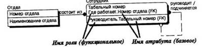 Рис. 26. Имена ролей внешних ключей В примере, приведенном на рис.26, в сущности Сотрудник внешний ключ Номер отдела имеет функциональное имя "Где работает", которое показывает, какую роль играет этот атрибут в сущности. По умолчанию в списке атрибутов показывается только имя роли. Для отображения полного имени атрибута (как функционального имени, так и имени роли) следует в контекстном меню, которое появляется, если щелкнуть левой кнопкой мыши по любому месту диаграммы, не занятому объектами модели, выбрать пункт Display Options/Entities и затем включить опцию Rolename/Attribute (рис.25). Полное имя показывается как функциональное имя и базовое имя, разделенные точкой (см. рис. 26). Обязательным является применение имен ролей в том случае, когда два или более атрибутов одной сущности определены по одной и той же области, т. е. они имеют одинаковую область значений, но разный смысл. На рис. 27 сущность Продажа валюты содержит информацию об акте обмена валюты, в котором участвуют две валюты - проданная и купленная. Информация о валютах содержится в сущности Валюта. Следовательно, сущности Продажа валюты и Валюта должны быть связаны дважды и первичный ключ - Номер валюты должен дважды мигрировать в сущность Валюта в качестве внешнего ключа. Необходимо различать эти атрибуты, которые содержат информацию о номере проданной и купленной валюты (имеют разный смысл), но ссылаются на одну и ту же сущность Валюта (имеют общую область значений). В примере на рис. 27 атрибуты получили имена ролей Проданная и Купленная.