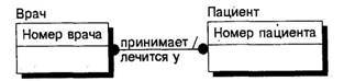 Рис. 31. Связь многие-ко-многим Для внесения связи следует установить курсор на кнопке Связь многие-ко-многим должна именоваться двумя фразами - в обе стороны (в примере "принимает/лечится"). Это облегчает чтение диаграммы. Связь на рис. 31 следует читать Вран <принимает> Пациент"а, Пациент <лечится> у Врач"а. При переходе к физическому уровню ERwin автоматически преобразует связь многие-ко-многим, добавляя новую таблицу и устанавливая две новые связи один-ко-многим от старых к новой таблице (рис. 32, сверху). При 'этом имя новой таблице присваивается автоматически как “Имя1 Имя2".