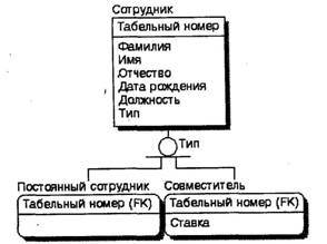 Рис. 34. Пример характеристической сущности "Хобби " Ассоциативная - сущность, связанная с несколькими родительскими сущностями. Такая сущность содержит информацию о связях сущностей. Примером ассоциативной сущности является Visit на рис. 33. Именующая - частный случай ассоциативной сущности, не имеющей собственных атрибутов (только атрибуты родительских сущностей, мигрировавших в качестве внешнего ключа). Примером именующей сущности является Doctor_Patient на рис.32. Категориальная - дочерняя сущность в иерархии наследования. Иерархия наследования (или иерархия категорий) представляет собой особый тип объединения сущностей, которые разделяют общие характеристики. Например, в организации работают служащие, занятые полный рабочий день (постоянные служащие) и совместители. Из их общих свойств можно сформировать обобщенную сущность (родовой предок) Сотрудник (рис.35), чтобы представить информацию, общую для всех типов служащих. Специфическая для каждого типа информация может быть* расположена в категориальных сущностях (потомках) Постоянный сотрудник и Совместитель. Обычно иерархию наследования создают, когда несколько сущностей имеют общие по смыслу атрибуты, либо когда сущности имеют общие по смыслу связи (например, если бы Постоянный сотрудник и Совместитель имели бы сходную по смыслу связь "работает в" с сущностью Организация), либо когда это диктуется бизнес-правилами. Для каждой категории можно указать дискриминатор - атрибут родового предка, который показывает, как отличить одну категориальную сущность от другой (атрибут Тип на рис. 35).