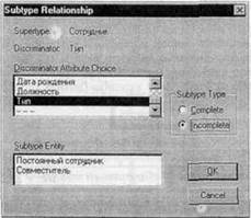 Рис. 38. Диалог Subtype Relationship Рассмотрим возможные стадии построения иерархии наследования. Определение сущностей с общими (по определению) атрибутами. Предположим, в процессе проектирования созданы сущности Постоянный сотрудник и Совместитель (рис. 39). Можно заметить, что часть атрибутов у этих сущностей (Фамилия, Имя, Отчество, Дата рождения, Должность) имеет одинаковый смысл.