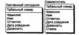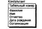 Рис. 39. Сущности с общими по смыслу атрибутами Перенос общих атрибутов в сущность - родовой предок. В случае обнаружения совпадающих по смыслу атрибутов следует создать новую сущность (Сотрудник) - родовой предок и перенести в нее общие атрибуты (Фамилия, Имя, Отчество, Дата рождения. Должность). Создание неполной структуры категорий. Создается категориальная связь от новой сущности - родового предка к старым сущностям - потомкам. Новая сущность дополняется атрибутом-дискриминатором категории (Тип) (см. рис. 35). Создание полной структуры категорий. Проводится дополнительный поиск сущностей, имеющих общие по смыслу атрибуты с родовым предком. В примере это сущность Консультант (рис. 40).
