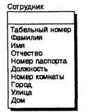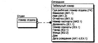 Рис. 45. Сущность "Сотрудник" с отображением ключей На диаграмме атрибуты альтернативных ключей обозначаются как (AKn.m), где n - порядковый номер ключа, m - порядковый номер атрибута в ключе. Когда альтернативный ключ содержит несколько атрибутов, (AKn.m) ставится после каждого. На рис. 45 атрибуты Фамилия, Имя, Отчество и Дата рождения входят в альтернативный ключ № 1 (АК1), Номер паспорта составляет альтернативный ключ № 2 (АК2). Инверсионные входы обозначаются как (IEn.m), где n - порядковый номер входа, m -порядковый номер атрибута. Инверсионный вход IE1 (атрибут Должность) позволяет выбрать всех сотрудников, занимающих одинаковую должность, IE2 (атрибуты Город и Улица) - всех сотрудников, живущих на одной улице, IE3 (атрибут Номер комнаты) - всех сотрудников, работающих в одной комнате, a IE4 (атрибут Дата рождения) - всех сотрудников, родившихся в один день. Если один атрибут входит в состав нескольких ключей, ключи перечисляются в скобках через запятую (атрибут Дата рождения входит в состав АК1 и IE4). По умолчанию номера альтернативных ключей и инверсионных входов рядом с именем атрибута на диаграмме не показываются. Для отображения номера следует в контекстном меню, которое появляется, если щелкнуть левой кнопкой мыши по любому месту диаграммы, не занятому объектами модели, выбрать пункт Display Options/Entities и затем включить опцию Alternate Key Designator (AK). Внешние ключи (Foreign Key) создаются автоматически, когда связь соединяет сущности: связь образует ссылку на атрибуты первичного ключа в дочерней сущности и эти атрибуты образуют внешний ключ в дочерней сущности (миграция ключа). Атрибуты внешнего ключа обозначаются символом (FK) после своего имени (см. рис. 45). Атрибут внешнего ключа Где работает. Номер отдела ("Где работает" - имя роли) является атрибутом первичного ключа (РК) в сущности Отдел. Зависимая сущность может иметь один и тот же внешний ключ из нескольких родительских сущностей. Сущность может также получить один и тот же внешний ключ несколько раз от одного и того же родителя через несколько разных связей. Когда ERwin обнаруживает одно из этих событий, он распознает, что два атрибута одинаковы, и помещает атрибут внешнего ключа в зависимой сущности только один раз. Хотя в закладке Key Group диалога Attribute Editor этот атрибут будет входить в два внешних ключа, на диаграмме он показывается только один раз. Это комбинирование или объединение идентичных атрибутов называется унификацией. Унификация производится, поскольку правила нормализации запрещают существование в одной сущности двух атрибутов с одинаковыми именами. В некоторых случаях (рис.46) этот результат соответствует действительности. Сотрудники работают в отделах, каждый сотрудник ведет несколько проектов. Сущность Отдел связана идентифицирующей связью с сущностью Сотрудник и Проект, ее первичный ключ Номер отдела мигрирует в состав первичного ключа дочерних сущностей в качестве внешнего ключа. Но сущность Сотрудник, в свою очередь, тоже имеет идентифицирующую связь с сущностью Проект и атрибуты ее первичного ключа (в том числе Номер отдела - второй раз!) мигрируют в состав первичного ключа сущности Проект.