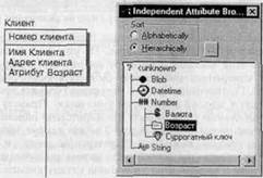 Рис. 57. Создание нового атрибута с помощью диалога Independent Attribute Browser ERwin имеет специальный инструмент, который значительно облегчает создание новых атрибутов в модели, используя описание доменов, -Independent Attribute Browser. Этот диалог вызывается (и скрывается) по горячему ключу CTRL+B. С его помощью можно выбрать в списке домен и по методу drag&drop перенести его в какую-либо сущность. В ней будет создан новый атрибут с именем, которое следует задать в окне Name Inherited by Attribite диалога Domain Dictionary Editor. Если значение поля не задано, по умолчанию принимается имя домена. На рис. 57 для домена "Возраст" значение этого поля было "Атрибут Возраст". В дальнейшем в случае необходимости имя атрибута.можно изменить.
