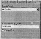 Рис.58. Диалог Domain Dictionary Editor на физическом уровне На физическом уровне диалог Domain Dictionary Editor позволяет редактировать физические свойства домена. На рис. 58 показана закладка ORACLE. Имя этой закладки зависит от выбранного сервера БД. На ней можно задать конкретный тип данных, соответствующих домену, правила присвоения NULL-значений, правила валидации (правила проверки допустимых значений) и задания значения по умолчанию. Правила валидации и значения по умолчанию должны быть предварительно описаны и именованы (на рис. 58 для домена "Возраст" заданы соответственно правило валидации "Проверка_возраста" и значение по умолчанию "Возраст по умолчанию"). Для вызова диалогов редактирования правил валидации и значений по умолчанию служат кнопки “…” справа от соответствующего списка выбора (Valid и Default). Рассмотрим функции других закладок диалога Domain Dictionary Editor: General (рис. 59). Задание родительского домена (Domain Parent) и имени, присваиваемого колонке при ее создании с помощью Independent Column Browser. С помощью опции Physical Only домен можно определить только на уровне физической модели. Comment. Внесение комментария к атрибуту. UDP. Свойства, определяемые пользователем. Visual Basic - PowerBuilder. Задание специальных свойств домена для кодогенерации клиентского приложения.