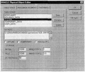 ERwin поддерживает объекты физической памяти для нескольких СУБД. Все объекты создаются в модели при обратном проектировании однако объекты INFORMIX, SQL Server и SYBASE не создаются при пря-' мом проектировании. Для создания и редактирования объектов физической памяти в ERwin используется редактор Physical Object (меню Server/Physical Object). Вид этого редактора зависит от выбранной СУБД. В качестве примера рассмотрим создание и редактирование объектов физической памяти для ORACLE (рис. 77).