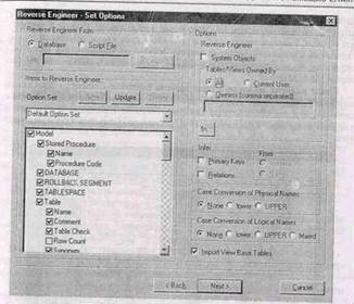 Рис. 106. Диалог Reverse Engineer - Set Options Опция Import View Base Tables указывает, что ERwin будет устанавливать связи между представлениями и таблицами. Если опция выключена или SQL-команда создания представления содержит сложные конструкции (например, агрегативные функции), колонки представления импортируются как определяемые пользователем. После установки необходимых опций можно щелкнуть по кнопке Next, после чего появляется диалог связи с БД (см. рис. 103), устанавливается сеанс связи с сервером и начинается процесс обратного проектирования, во время которого показывается статус процесса в диалоге Reverse Engineer-Status. В результате процесса создается новая модель данных. В процессе работы модель может изменяться и дополняться. С другой стороны, системный каталог БД может редактироваться другими проектировщиками. В результате спустя некоторое время после последнего сеанса обратного проектирования могут возникнуть расхождения между реальным состоянием системного каталога и моделью данных. Для синхронизации системного каталога БД и текущей модели следует выбрать пункт меню Tasks/Complete Compare или нажать кнопку После нажатия на кнопку Next диалога Complete Compare - Set Options возникает диалог связи с БД (см. рис. 103), устанавливается сеанс связи с сервером и в диалоге Complete Compare - Resolve Differences показывается текущее состояние модели (слева) и системного каталога СУБД (справа) (рис. 107).