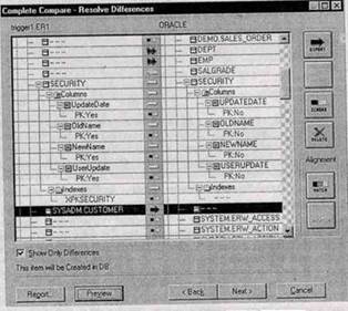 Рис. 107. Диалог Complete Compare - Resolve Differences В правой части диалога находятся кнопки, позволяющие задать режим синхронизации для каждого объекта модели или БД:
