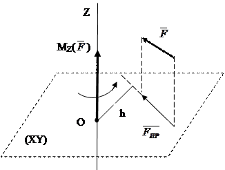 Момент сили відносно осі – це алгебраїчна величина (число), яка дорівнює моменту проекції цієї сили на площину, перпендикулярну осі, відносно точки перетину осі з площиною (рисунок 31).