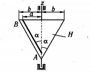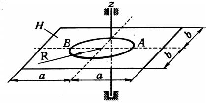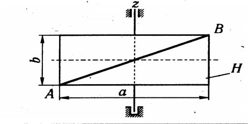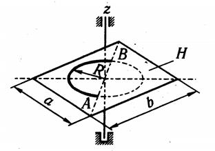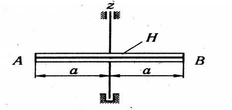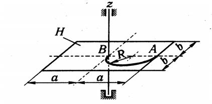 Тело H массой m1 вращается вокруг вертикальной оси z с постоянной угловой скоростью ω0 ; при этом в точке О желоба АВ тела Н на расстоянии АО от точки А, отсчитываемом вдоль желоба, закреплена материальная точка К массой m2 . В некоторый момент времени (t=0) на систему начинает действовать пара сил с моментом Mz =Mz (t). При t=τ действие пары сил прекращается.