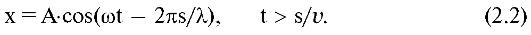 Если некоторая точка среды удалена от источника на расстояние s, а скорость волны равна v, то возмущение, созданное источником, достигнет этой точки через время τ = s/v. Поэтому фаза колебаний в рассматриваемой точке в момент времени t будет такой же, как фаза колебаний источника в момент времени (t - s/v), а амплитуда колебаний останется практически неизменной. В результате колебания данной точки будут определяться уравнением