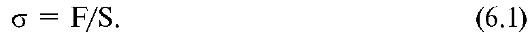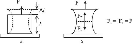 Этот вид деформации возникает, когда к стержню (бруску) с закрепленным основанием прикладывается сила F, направленная вдоль его оси (рис. 6.1, а). Под действием этой силы длина стержня увеличивается на некоторую величину Δ l (l - первоначальная длина). При этом в каждом сечении стержня возникают направленные по нормали силы (F1 и F2), равные по величине приложенной силе F и обусловленные изменением расстояния между частицами при растяжении. Сила F1 действует на верхнюю часть бруска со стороны нижней части; сила F2 - наоборот (рис. 6.1, б). Состояние растянутого тела характеризуется продольным (нормальным) напряжением σ, которое может быть вычислено для любого сечения тела, перпендикулярного приложенной силе.