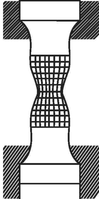 В большинстве случаев при растяжении или сжатии степень деформации в различных сечениях стержня различна. Это можно увидеть, если на поверхность тела нанести квадратную сетку. После деформирования сетка исказится. По характеру и величине этого искажения можно судить о распределении напряжения вдоль образца (рис. 6.2). Видно, что изменения формы ячеек сетки максимальны в средней части стержня и почти отсутствуют на его краях. Опытным путем было установлено, что небольшие деформации исчезают после снятия внешнего воздействия. Такие деформации называются упругими. Для них выполняется закон Гука: При упругой деформации напряжение прямо пропорционально величине относительной деформации: