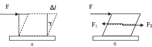 Сдвиг Деформация сдвига возникает, если на тело действует касательная сила, приложенная параллельно закрепленному основанию (рис. 6.3, а). В этом случае направление смещения свободного основания параллельно приложенной силе и перпендикулярно боковой грани. В результате деформации сдвига прямоугольный параллелепипед превращается в косоугольный. При этом боковые грани смещаются на некоторый угол γ, называемый углом сдвига. При сдвиге в каждом сечении стержня возникают касательные силы (F1 и F2), равные по величине приложенной силе F и обусловленные изменением расстояния между частицами (рис. 6.3, б). Сила F1действует на верхнюю часть бруска со стороны нижней части; сила F2 - наоборот.