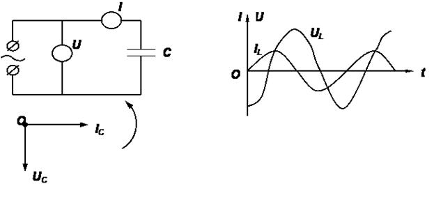 В цепи образуется переменный ток и в катушке возникает э.д.с. самоиндукции, равная. Сила тока " I " в цепи определяется из условия:,(так как сопротивлением " R " пренебрегаем) или. Преобразуем или. Интегрируем это уравнение , где. Постоянная интегрирования принимается С = 0, так как не имеет постоянной составляющей. Уравнение показывает, что ток в цепи, подобно напряжению, имеет синусоидальный характер, но по фазе запаздывает на угол. Сопоставляя максимальное значение тока с формулой закона Ома, видим, что в цепи с индуктивностью значение сопротивления имеет величина " wL ", которая обозначается XL.. Величина XL = wL = 2pnL называется индуктивным сопротивлением цепи и измеряется в Омах, при подстановке L - в Генри и n - в Герцах. Физический смысл индуктивного сопротивления состоит в том, что оно учитывает влияние на силу тока в цепи э.д.с. самоиндукции, противодействующей приложенному напряжению, и поэтому зависит от тех же величин, что и э.д.с. самоиндукции: индуктивности " L " и частоты w = 2pn, обусловливающей скорость изменения мгновенных значений тока. Э.д.с. самоиндукции, противодействующая изменению тока в цепи, вызывает запаздывание колебаний тока, по отношению к колебаниям напряжения. При чисто индуктивной цепи запаздывание происходит на угол, равный. Графики напряжения и тока в цепи с индуктивностью показаны на рисунке. На векторной диаграмме показано фазовое соотношение векторов амплитуд тока IL и напряжения UL: ток отстает на угол (углы отсчитываются по направлению против часовой стрелки). В цепи, содержащей индуктивное и активное сопротивление, угол запаздывания тока по фазе будет меньше и в зависимости от соотношения между ними может иметь значения в пределах от 0 до. В чисто индуктивном сопротивлении потерь энергии не происходит, в связи с чем оно называется реактивным. Определим характер переменного тока " I " в цепи с конденсатором, к которой приложено переменное напряжение U = Um sinwt.