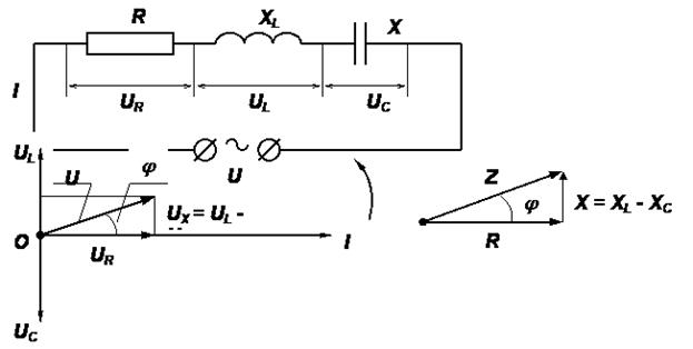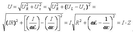 Вследствие наличия разности фаз между напряжениями UL и Uc и током I (UR находится в фазе с током) эти напряжения должны складываться между собой векторно (геометрически), образуя в сумме приложенное напряжение " U ". Напряжения UL и Uc имеют разность фаз с током I, равную, но противоположную по знаку, то есть они находятся между собой в противофазе и, следовательно, могут складываться алгебраически: Ux = UL - Uc (обычно UL > Uc). Напряжение UR находится в фазе с током I и, следовательно, имеет разность фаз с напряжением Ux = UL - Uc. Тогда напряжение U как гипотеза прямоугольного треугольника, катетами которого являются UR и Ux, и вычисляются по формуле: