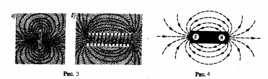 Линии магнитной индукции всегда замкнуты и охватывают проводники с током. В этом их различии от линий напряженности электростатического поля, являющихся разомкнутыми (они, как ранее рассматривалось, начинаются на положительных зарядах и кончаются на отрицательных). На ряс. 4 даны линии магнитной индукции полосового магнита; они выходят из северного полюса и входят в южный. Вначале думалось, что здесь видня полная аналогия с линиями напряженности электростатического поля и полюсы магнитов играют роль так называемых «магнитных зарядов» (магнитных монополей). Однако, опыты показали, что, разрезая магнит на части, его полюсы разделять нельзя, т. е. в отличие от электрических зарядов свободные «магнитные заряды» не существуют, поэтому линии магнитной индукции не могут обрываться на полюсах. В дальнейшем было показано, что внутри полюсовых магнитов существует магнитное поле, по свойствам аналогичное полю внутри соленоида, и линии магнитной индукции данного магнитного поля являются продолжением линий магнитной индукции вне магнита. Значит, для постоянных магнитов линии магнитной индукции их магнитного поля также являются замкнутыми.