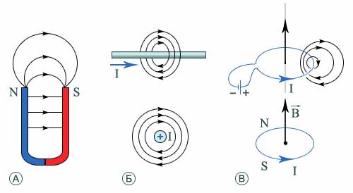 Рис. 8 Источником магнитного поля являются не только постоянные магниты, но и проводники с током. Картина силовых линий магнитного поля, созданного постоянным подковообразным магнитом (а), прямым проводом с током (б) и проволочным кольцом (в), по которому течет ток, показана на рисунке 9. Силовые линии магнитного поля – замкнутые линии. Во внешнем пространстве постоянных магнитов они идут от северного полюса к южному. Направление силовых линий вокруг прямолинейного провода с током определяется по правилу буравчика (правовращающий винт, штопор): если направление поступательного движения буравчика совпадает с направлением тока в проводнике, то направление вращения ручки буравчика совпадает с направлением вектора магнитной индукции.