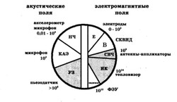 Физическое поле - особый вид материи. Физические поля связывают составные части вещества в единые системы и передают с конечной скоростью действие одних частиц на другие. Различают гравитационные, электромагнитные и другие поля. Вокруг человека существуют электромагнитные и акустические поля (гравитационное поле и элементарные частицы остаются за пределами нашего рассмотрения). Можно выделить основные 4 диапазона электромагнитного излучения и 3 диапазона акустического излучения, в которых ныне ведутся исследования (рис. 12.1).