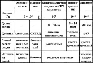Рис. 12.1. Схема электромагнитных (справа) и акустических (слева) собственных полей человека. Электромагнитные поля: Е - электрическое поле, В - магнитное, СВЧ - сверхвысокочастотные электромагнитные волны дециметрового диапазона, ИК - электромагнитные волны инфракрасного диапазона, видимое - оптический диапазон излучений. Акустические поля: НЧ - низкочастотные колебания, КАЭ - кохлеарная акустическая эмиссия, УЗ - ультразвуковое излучение. Цифры - характерные частоты излучений (в герцах). Заштрихованы области тепловых излучений. Справа и слева указаны названия датчиков и приборов для регистрации соответствующих полей. СКВИД - сверхпроводящий квантовый интерферометр, ФЭУ — фотоэлектрический умножитель. Электромагнитные поля. Диапазон собственного электромагнитного излучения ограничен со стороны коротких волн оптическим излучением, более коротковолновое излучение - включая рентгеновское и у-кванты - не зарегистрировано. Со стороны длинных волн диапазон можно ограничить радиоволнами длиной около 60 см. В порядке возрастания частоты четыре диапазона электромагнитного поля, представленные на рис. 12.1, включают в себя: · низкочастотное электрическое (Е) и магнитное (В) поле (частоты ниже 103 Гц); · радиоволны сверхвысоких частот (СВЧ) (частоты 109- 1010 Гц и длина волны вне тела 3-60 см); · инфракрасное (ИК) излучение (частота 10м Гц, длина волны 3-10 мкм); · оптическое излучение (частота 1015 Гц, длина волны порядка 0,5 мкм). Такой выбор диапазонов обусловлен не техническими возможностями современной электроники, а особенностями биологических объектов и оценками информативности различных диапазонов для медицины. Характерные параметры различных электромагнитных полей, создаваемых телом человека, приведены в табл. 12.1.