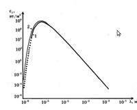 Рис. 12.2. Спектральная плотность излучательной способности теплового электромагнитного излучения абсолютно черного тела как функция длины волны X. Выбраны логарифмические шкалы по обеим осям, поскольку величины е^т и X, изменяются на много порядков. Небольшие видимые отличия кривых 1 и 2 на самом деле соответствуют большим изменениям е^т(в несколько раз) В порядке возрастания частоты (цифры на рис. 12.1) три диапазона акустического поля включают в себя: 1) низкочастотные колебания (частоты ниже 10я Гц); 2) кохлеарную акустическую эмиссию (КАЭ) - излучение из уха человека (V ~103 Гц); 3) ультразвуковое излучение (V - 1-10 МГц). Источники акустических полей в различных диапазонах частот имеют разную природу. Низкочастотное излучение создается физиологическими процессами: дыхательными движениями, биением сердца, током крови в кровеносных сосудах и некоторыми другими процессами, сопровождающимися колебаниями поверхности человеческого тела в диапазоне приблизительно 0,01 - 103 Гц. Это излучение в виде колебаний поверхности можно зарегистрировать контактными, либо бесконтактными методами, однако его практически невозможно измерить дистанционно с помощью микрофонов. Это связано с тем, что идущие из глубины тела акустические волны практически полностью отражаются обратно от границы раздела «воздух-тело человека* и не выходят наружу в воздух из тела человека. Коэффициент отражения звуковых волн близок к единице из-за того, что плотность тканей тела человека близка к плотности воды, которая на три порядка выше плотности воздуха. У всех наземных позвоночных существует, однако, специальный орган, в котором осуществляется хорошее акустическое согласование между воздухом и жидкой средой, - это ухо. Среднее и внутреннее ухо обеспечивают передачу почти без потерь звуковых волн из воздуха к рецепторным клеткам внутреннего уха. Соответственно, в принципе, возможен и обратный процесс - передача из уха в окружающую среду - и он обнаружен экспериментально с помощью микрофона, вставленного в ушной канал. Источником акустического изучения мегагерцевого диапазона является тепловое акустическое излучение - полный аналог соответствующего электромагнитного излучения. Оно возникает вследствие хаотического теплового движения атомов и молекул человеческого тела. Интенсивность этих акустических волн, как и электромагнитных, определяется абсолютной температурой тела.