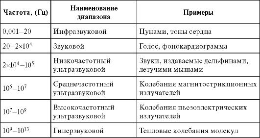 Характерной особенностью механических волн является то, что они распространяются в материальных средах (твердых, жидких или газообразных). Существуют волны, которые способны распространяться и в пустоте (например, световые волны). Для механических волн обязательно нужна среда, обладающая способностью запасать кинетическую и потенциальную энергию. Следовательно, среда должна обладатьинертными и упругими свойствами. В реальных средах эти свойства распределены по всему объему. Так, например, любой малый элемент твердого тела обладает массой и упругостью. В простейшей одномерной модели твердое тело можно представить как совокупность шариков и пружинок (рис. 2.6.3). Если в каком-либо месте упругой среды (твердой, жидкой или газообразной) возбудить колебания ее частиц, то вследствие взаимодействия между частицами это колебание начнет распространяться в среде от частицы к частице с некоторой скоростью v. Например, если в жидкую или газообразную среду поместить колеблющееся тело, то колебательное движение тела будет передаваться прилегающим к нему частицам среды. Они, в свою очередь, вовлекают в колебательное движение соседние частицы и так далее. При этом все точки среды совершают колебания с одинаковой частотой, равной частоте колебания тела. Эта частота называется частотой волны. Волной называется процесс распространения механических колебаний в упругой среде. Частотой волны называется частота колебаний точек среды, в которой распространяется волна. С волной связан перенос энергии колебаний от источника колебаний к периферийным участкам среды. При этом в среде возникают периодические деформации, которые переносятся волной из одной точки среды в другую. Сами частицы среды не перемещаются вместе с волной, а колеблются около своих положений равновесия. Поэтому распространение волны не сопровождается переносом вещества. В соответствии с частотой механические волны делятся на различные диапазоны, которые указаны в табл. 2.1. Таблица 2.1. Шкала механических волн