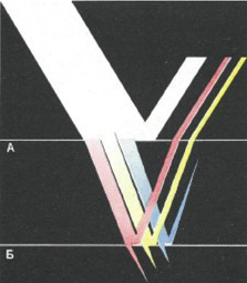 Мы рассматривали наиболее прозрачные тела — воздух и стекло — в проходящем свете первоисточников, оставляя в стороне источники отраженного света. Но в действительности большая часть цветовых ощущений является следствием просвечивания тел отраженным светом. Если мы, рассматривая прозрачное тело на просвет, заменим прямой свет первоисточника каким- либо отраженным светом, то ощущение света возникает с той же закономерностью; изменится лишь яркость цвета, потому что отраженный свет слабее прямого. Отраженный свет есть та причина, которая дает возможность видеть на просвет как большие прозрачные тела, так и небольшие частицы малопрозрачных тел и чувствовать их цвет. Разноцветные стекла, положенные на черный бархат, будут казаться черными; положенные же на белую бумагу обнаружат свои разнообразные цвета. Здесь, следовательно, появится источник отраженного света — белая бумага,— который просвечивает сквозь стекла и обнаруживает их цвет. На рис. 13 схематично показаны лучи света, проходящие прозрачные тела А, Б. Свет, встречая на своем пути среду А, распадается на две части. Первая отражается от внешней поверхности под углом падения без качественного изменения. Вторая доля света, преломляясь, продолжает свой путь в среде А в измененном направлении; это изменение тем больше, чем больше меняется скорость света при переходе в данную среду из предыдущей. Среда А будет рассеивать и поглощать вторую долю света, пока световая энергия не иссякнет или пока свет не пройдет всю толщу среды А и не встретит среду Б, по-своему изменяющую скорость движения света. Тогда свет вновь распадается на две части: преломившаяся часть света пойдет дальше, а отраженная возвратится обратно сквозь среду А и будет изнутри просвечивать эту среду, выявляя ее цвет. Та доля дневного света, которая отражается или рассеивается поверхностью тел и не меняет спектрального состава белого света, влияет только на светлоту предметов; отражение же света из глубины тела при том или ином поглощении света создает условия видимости тела на просвет и поэтому обнаруживает цветовые качества предмета. Бокал чистой воды, поставленный в черную камеру и освещенный из узкого отверстия слева дневным белым светом, будет обнаруживать себя лишь бликами отраженного света. На рис. 14 сверху левые блики лежат на поверхности бокала со стороны падения света, правые — со стороны перехода света в следующую среду — воздух. Если в бокал налить черной туши, то правые блики исчезнут, ибо свет, проникающий в черноту туши, поглощается безвозвратно. Если в бокал налить красного вина, то правые блики станут интенсивного красного цвета. Свет правого блика дважды пересечет среду вина в прямом и возвратном направлениях. Возвратный свет, пройдя двукратное избирательное поглощение, даст возможность видеть вино на просвет и выявить его окраску. В условиях черной камеры, полностью поглощающей свет, мы будем ощущать цвет вина только в том месте, где оно будет видимо на просвет от правого блика. В остальных частях вино будет казаться черным. Если же бокал перенести в окружение белых предметов, то получим много всестороннего отраженного света, который на просвет обнаружит цвет всего вина. Если вместо бокала вина мы возьмем прозрачную ягоду красной смородины, то получим ту же картину в уменьшенном масш
