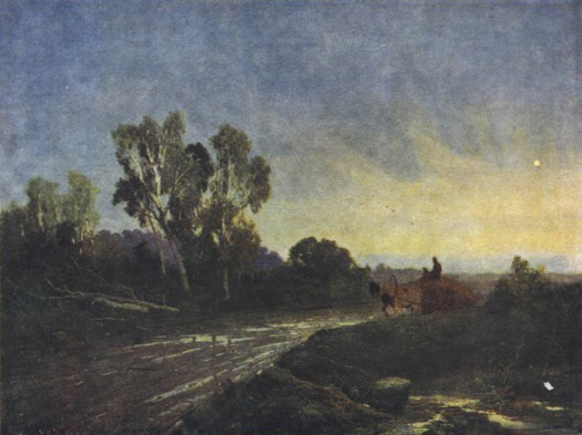 Рис. 22. Вечернее освещение. Фрагмент картины А. И. Куинджи «Вечер в Малороссии». В конце дня наиболее интенсивные краски чувствуются в освещенных местах, соответствующих средней освещенности. Кроме того, прямые лучи солнца, проходящие сквозь вечерний воздух, насыщенный дневными испарениями и пылью, после избирательного поглощения приобретают теплый оттенок и создают дополнительную характерную теплоту вечернего колорита.
