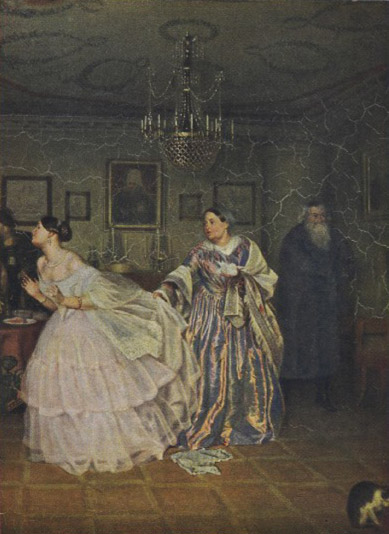 Рис. 19. Обусловленный цвет и световая перспектива в интерьере. Фрагмент картины П. А. Федотова «Сватовство майора». Пространственные координаты персонажей определяются степенью их светлоты, т. е. расстоянием от окна, находящегося на переднем плане, за спиной зрителя. Для усиления эффекта световой перспективы художник изобразил невесту в светлом платье, мать — в платье средней светлоты, отца — в темном костюме.