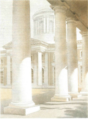 Рис. 37. Соединение туши с голубой краской. Тушь применяется как теплая краска. Наряду с тем, что она может служить для уплотнения тона, тушь может быть применена и для изображения собственных теней и рефлексов. Такое соединение придает чертежу воздушно-серебристый колорит.