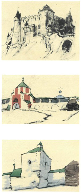 Рис. 40. Работа сухой и влажной кистью. Архитектурные рисунки С. В. Ноаковского. Вверху можно видеть, как сухая кисть передает фактуру освещенных мест, а влажная кисть — прозрачность собственных и падающих теней. Внизу показана работа тонкой и широкой кистью.