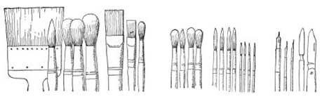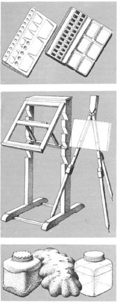 Рис. 43. Инструменты и оборудование. Вверху — фарфоровая и металлическая палитры; в середине— акварельный этюдник с пяльцами для натягивания бумаги, палитрой, красками, кистями и бачком для воды; внизу — греческая губка, резиновый и стеклянный бачки; слева — набор беличьих, колонковых и щетиновых кистей, необходимые перья и ножи. Date: 2015-09-24; view: 440; Нарушение авторских прав |