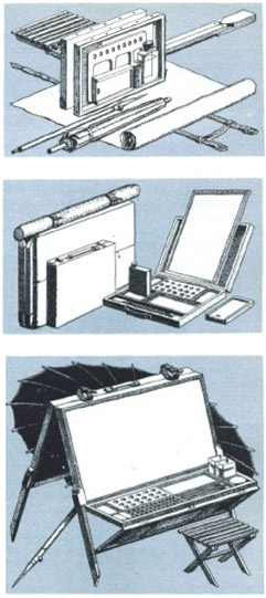 Рис. 44. Инструменты и оборудование. Набор необходимых предметов для работы на открытом воздухе. Два подрамника с натянутой бумагой, палитра, краски, бачок, блокнот и складной стульчик завертывают в клеенку. Набор стягивается ремнями вместе со складным зонтом. Перо — прекрасный инструмент для деталировки, о нем непростительно часто забывают акварелисты. Наряду с тонкой кистью перо имеет большие возможности в акварельной технике; оно прекрасно служит нанесению цветного контура акварельными чернилами, дает тонкие и острые штрихи в мелких деталях; удобно для уточнения формы, для ретуши, для реставрации поврежденных и переделываемых мест. Будучи хорошо отточено, перо дает мягкие линии, а иногда заменяет кисть. Нож акварелиста снимает краску с бумаги. Это бывает необходимо в освещенных местах. Острым и тонким концом ножа, не нарушая поверхности бумаги, можно получить светлый блик. Всем лезвием ножа хорошо снимать краску с зернистой бумаги, обнаруживая этим структуру зерна и придавая красочному слою необходимую фактуру изображаемого материала с последующей обработкой кистью. Работа ножом требует большой осторожности и ограничения; разодранная скоблением акварель производит отталкивающее впечатление. Осторожно обработанная ножом, она дает полное впечатление фактурного красочного слоя. В мастерской необходимо оборудовать специальный стол для палитры, кистей, воды, бумаги, красок и других инструментов. Хорошо оборудованный стол освобождает от нервной суматохи, от поисков нужных инструментов и материалов, способствует спокойной и сосредоточенной работе. Стул художнику нужен лишь для временного отдыха и, самое большее, для детализации изображения. Когда акварелист садится на стул, ставит на колени подрамник, берет в руки палитру с красками и т. д., тогда у него начинает пропадать желание двигаться, отходить, чтобы видеть свою работу на расстоянии. Его невольно начинают увлекать детали, второстепенные подробности колорита, и вскоре он по своему творческому состоянию начинает переходить от живописи к рукоделию. Ответственная работа живописца требует непрерывных отходов, оценки каждого мазка как нанесенного, так и предполагаемого к нанесению, с многих, различно удаленных точек зрения. Лишь только для того, чтобы нанести мелкую деталь и не держать в это время руку на весу, может понадобиться стул. Суровая обстановка мастерской не диктуется рисовкой или надуманной позой. Она необходима для требовательной творческой работы. Смягчение требовательности в этом отношении может быть допущено лишь в случае болезни или каких-либо физических недостатков. Итак, подбор инструментов и оборудования мастерской оказывают значительное влияние на ход работы как в техническом, так и в творческом отношении. Однако нельзя сваливать неудачи в работе целиком на неудовлетворительную обстановку, материалы, инструменты. Решает успех целеустремленный, творческий труд художника. Но нужно всячески стремиться приспособить существующую обстановку для улучшения работы; сколько позволяют условия, оборудовать рабочее место лучшими материалами и инструментами. Продуманный подбор материалов и инструментов — начало успешной работы.