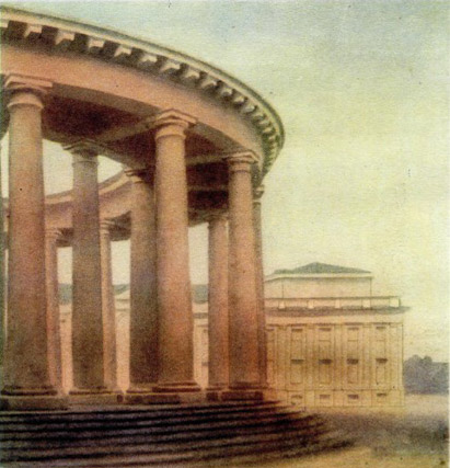 Рис. 82. Архитектурный рисунок. Акварель А. П. Брюллова «Раскопки Помпеи». Пример живописного изображения архитектуры в мелком масштабе с тщательной проработкой деталей и реалистической передачей солнечного освещения. Для полного представления о такой светотени целесообразно рассмотреть несколько примеров из числа помещенных в настоящей книге репродукций с картин и проектов. Кроме упомянутого фрагмента фасада храма Венеры в Помпеях, выполненного С. А. Ивановым (рис. 83), следует рассмотреть акварель К. П. Брюллова «Последний день Помпеи» (рис.65). Центральное место картины залито солнцем. Светотень фигур характеризуется яркими солнечными бликами и сильными рефлексами от земли и окружающих предметов. При сильном всестороннем освещении фигуры светятся всеми фазами светотени. Если привести примеры из масляной живописи, то следует назвать такие картины, как «Московский дворик» В. Д. Поленова (рис. 21), где светотень белого храма с колокольней также сияет всеми фазами светотени, или «Тадж-Махал» В. В. Верещагина (рис. 128), где белый индийский храм на фоне южного синего неба светится и освещенными, и теневыми сторонами, или «Московский Кремль» А. К. Саврасова (рис. 127), где дворец выделяется своим светлым силуэтом на фоне облачного неба.