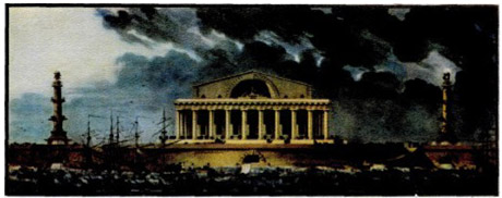 Рис. 115. Приемы мастеров начала XXIX века в акварельной архитектурной графике. Проект петербургской Биржи. Чертеж Тома де Томона. В проекте правдиво передана природная среда будущего сооружения и ее колорит.