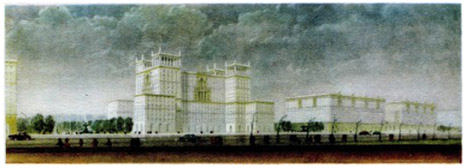 Рис. 121. Работы молодых советских архитекторов. Перспектива вокзала в Москве. Дипломная работа студента Московского архитектурного института В. Кубасова.