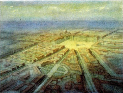 Рис. 123. Приемы изображения перспективных планов. Панорама Ленинграда. При низком горизонте перспективные планы, заслоняющие друг друга, расчленены различно освещенными зданиями. Прием ярких дальних планов не только хорошо выявляет глубину пространства, но и силу света. Из зрительной практики мы знаем, что свет дальних планов, пройдя поглощение воздушной средой, доходит до нас ослабленным; если при этом дальний свет все же кажется достаточно ярким, то это говорит об очень большой яркости света дальнего плана. При слабом освещении дальних планов они почти не видны; свет их перекрывается рассеянным светом воздуха близких планов и почти совсем не достигает до нас. В выборе направления света важно учитывать архитектурную композицию и рельеф местности. При плоском рельефе важно иметь в виду в первую очередь архитектурные сооружения и их формы. Для холмистой местности избирают такое направление света, которое выявляет и архитектурную композицию, и форму рельефа местности. Колорит панорамы во многом зависит от географических условий изображаемого места. При изображении южных районов освещение панорамы характеризуется общим теплым, светлым тоном картины, преобладанием резкой светотени от прямого света солнца, резкими очертаниями дальних планов в силу сухости воздуха, белесоватыми освещенными местами и насыщенными по цвету тенями и т. д. Для севера освещение панорамы характеризуется общим голубоватым или белесоватым тоном, отсутствием резкой светотени, мягкими очертаниями дальних планов, погруженных в голубую дымку влажного, туманного воздуха, интенсивным цветом на освещенных местах переднего плана и голубоватыми обобщающими все цвета мягкими тенями. В зависимости от точки зрения или от высоты горизонта на картинной плоскости небо в изображении панорамы приобретает то или иное значение. Если горизонт высок, то неба остается мало, оно видно лишь у горизонта, где делается светлым, без особого рисунка облаков, просто, незаметно. Все внимание обращается на развернутый план местности и архитектуру. Если горизонт низок и неба на картинной плоскости панорамы много, оно существенно влияет на изображение; видимое и в зените, и у горизонта, оно требует сообразно с архитектурой композиционного решения, окраски и т. д. При низком горизонте небо служит важной частью фона архитектурной композиции и должно в своем построении способствовать образной выразительности картины.