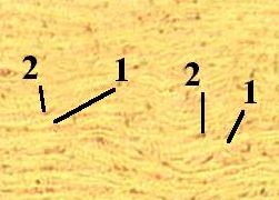 Видны пучки эластических волокон (1) и между ними – клетки (фиброциты) (2).