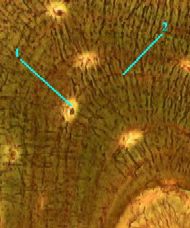 и костные канальцы (2), содержащие отростки остеоцитов.