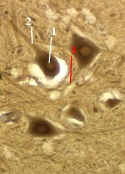 Вышеуказанные глыбки содержатся в теле (1) нейрона и в некоторых отростках (2).