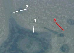 тёмную цитоплазму, более светлое ядро (1) и отростки (2 и 3).