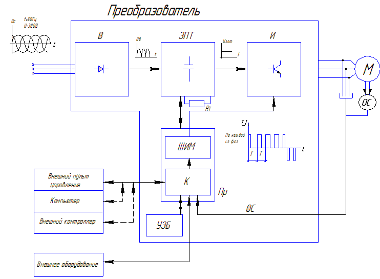 Рис. 2.36. Изменение напряжения с помощью ШИП Скважность импульсов: q= где T – период следования импульсов, T = 1/ f; f – несущая частота импульсов; t – длительность импульсов, t = var. Так как несущая частота высокая, f = 1…10 кГц, ступеньки напряжения малы (на рисунке они утрированы), кривая напряжения получается гладкой. Функциональная схема преобразователя частоты для трехфазного электродвигателя переменного тока изображена на рис. 2.37. На вход контроллера К подаются управляющие сигналы от внешнего или внутреннего пульта управления или от компьютера или от внешнего контроллера. На контроллер К поступают сигналы обратных связей (ОС) по частоте, току и напряжению на двигателе, по скорости вращения двигателя (при наличии датчика скорости ДС). Контроллер имеет входы для подключения устройств защиты и блокировки (УЗБ). Контроллер имеет входы и выходы для подключения внешнего технологического оборудования. С помощью пульта управления или компьютера в контроллер вводятся параметры двигателя и нагрузки на двигатель (статический момент на валу, приведенный момент инерции и т. п.) и отображается модель привода. В соответствии с выбранным принципом управления приводом (логикой управления), моделью привода и внешними управляющими сигналами, контроллер К вырабатывает оптимальные для работы привода управляющие сигналы в виде импульсов соответствующей частоты и амплитуды. Импульсы несут информацию о частоте и напряжении питания двигателя. Импульсы управления поступают в широтно-импульсный модулятор (ШИМ), где в соответствии с ними, по каждой из 3-х фаз, вырабатываются импульсы постоянной несущей частоты и переменной длительности.