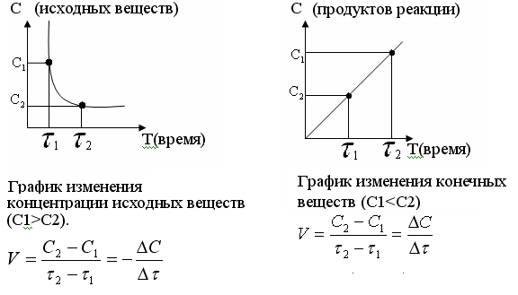 Скоростью химической реакции (υ) называется изменение концентрации реагирующих веществ в единицу времени. По изменении концентрации одного из веществ, участвующих в реакции можно судить об изменении концентрации всех остальных веществ. Пусть за промежуток времени от