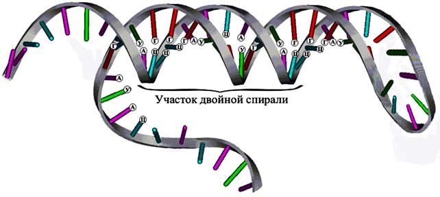 Рис. 3. Вторичная структура РНК. Основная роль РНК - непосредственное участие в биосинтезе белка. Известны три вида клеточных РНК, которые отличаются по местоположению в клетке, составу, размерам и свойствам, определяющим их специфическую роль в образовании белковых макромолекул: 1) Информационные (матричные) РНК передают закодированную в ДНК информацию о структуре белка от ядра клетки к рибосомам, где и осуществляется синтез белка; 2) Транспортные РНК собирают аминокислоты в цитоплазме клетки и переносят их в рибосому; молекулы РНК этого типа "узнают" по соответствующим участкам цепи информационной РНК, какие аминокислоты должны участвовать в синтезе белка; 3) Рибосомные РНК обеспечивают синтез белка определенного строения, считывая информацию с информационной (матричной) РНК. Date: 2015-09-24; view: 1100; Нарушение авторских прав |