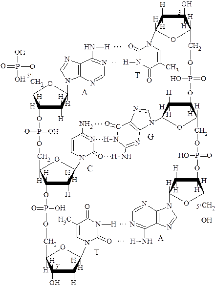 1) Данный олигонуклеотид имеет 5¢-концевую OH-группу у аденозина и 3¢-концевую OH-группу у тимидина. Формула заданного фрагмента ДНК имеет вид: