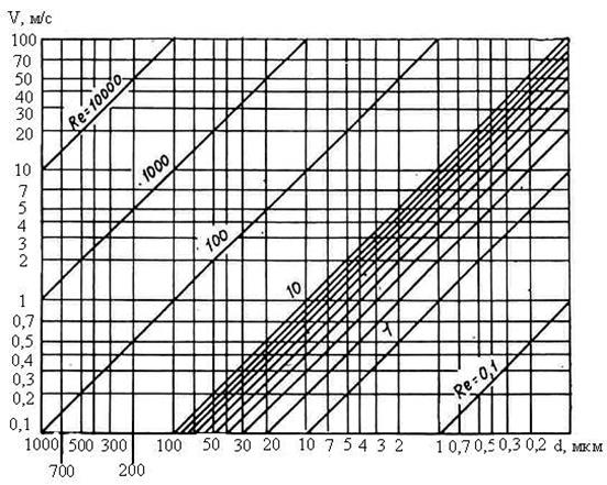 Рис. 4.8. Значения критерия Re для движения сферических частиц в воде при t = 20 0C